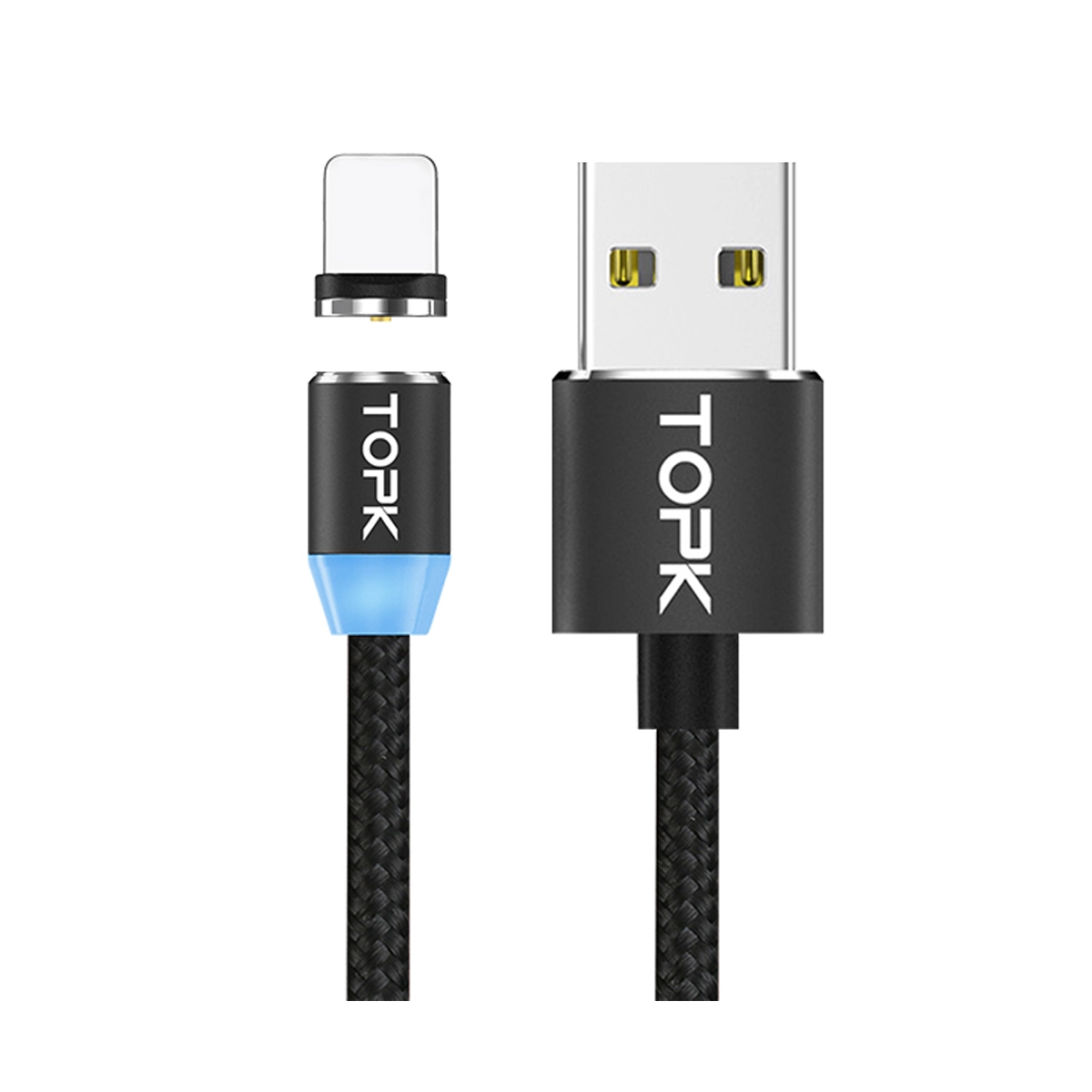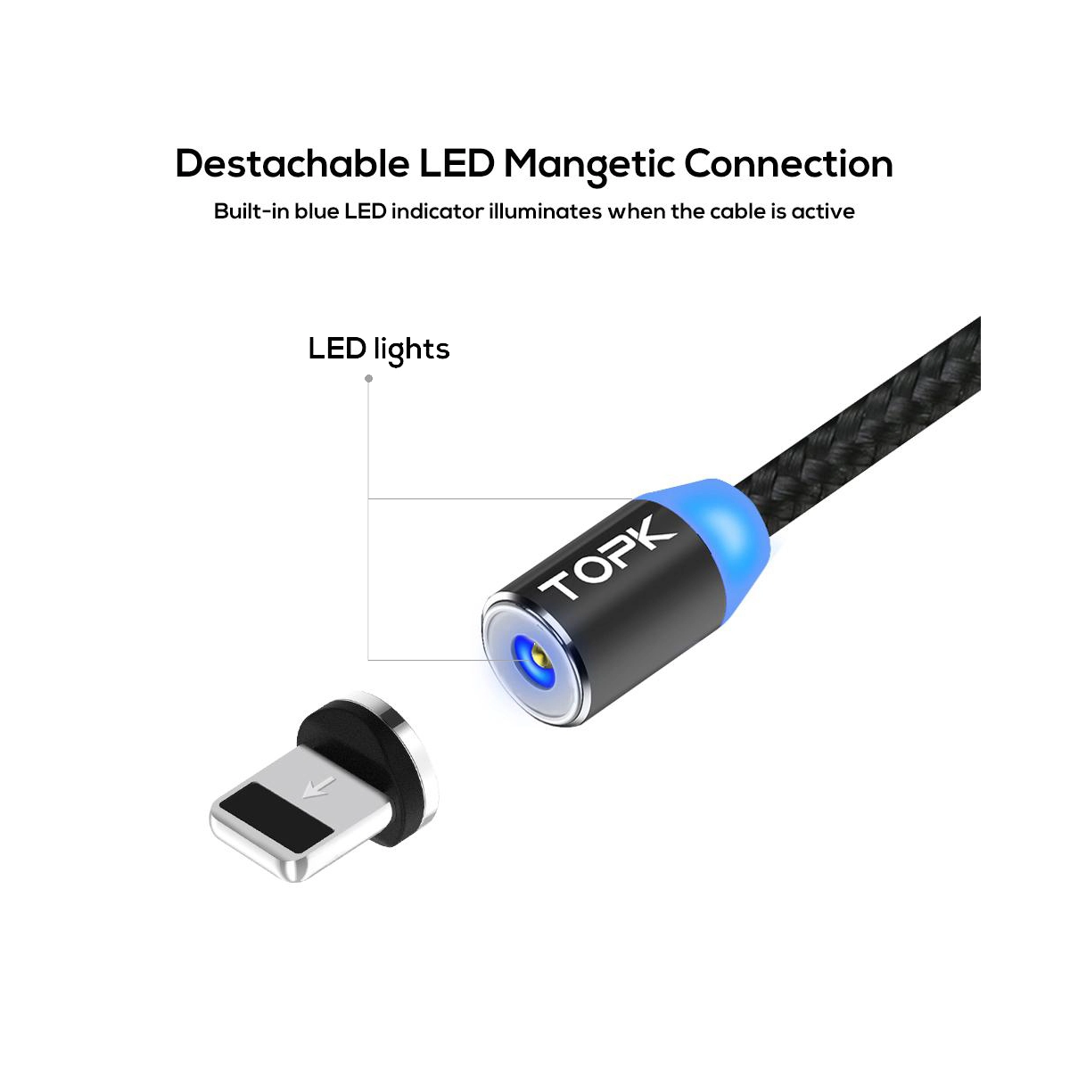 Cablu magnetic incarcare telefon, TOPK, LED 1m, 2.4A USB, rotatie 360, compatibil cu iPhone sau iPad, negru