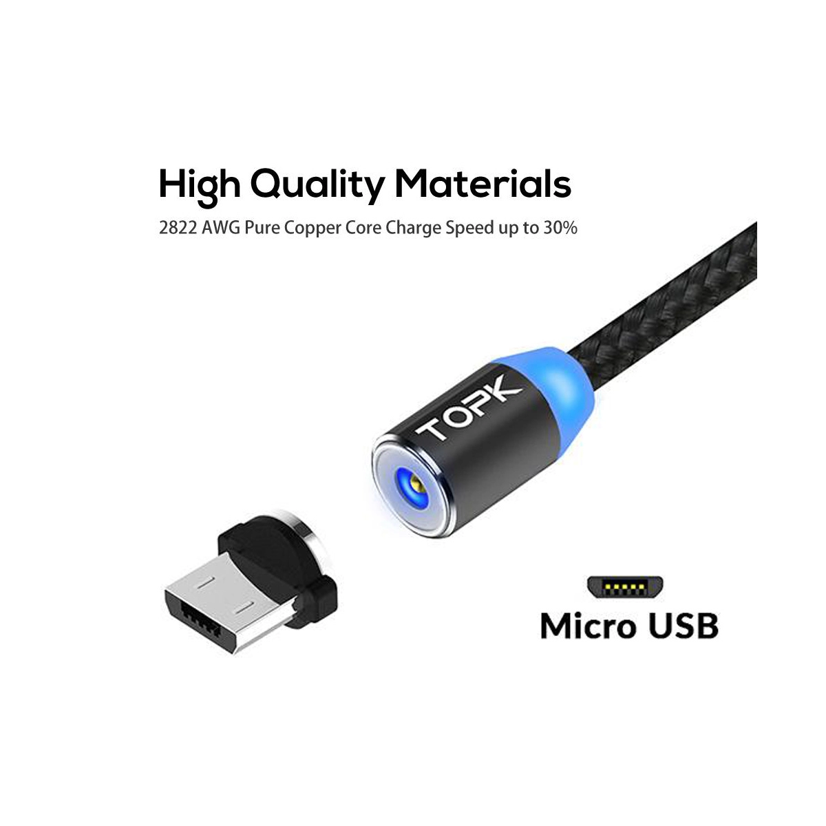 Cablu magnetic incarcare telefon, TOPK, LED, 1m, 2.4A USB Micro USB, rotatie 360, compatibil cu majoritatea telefoanelor, negru