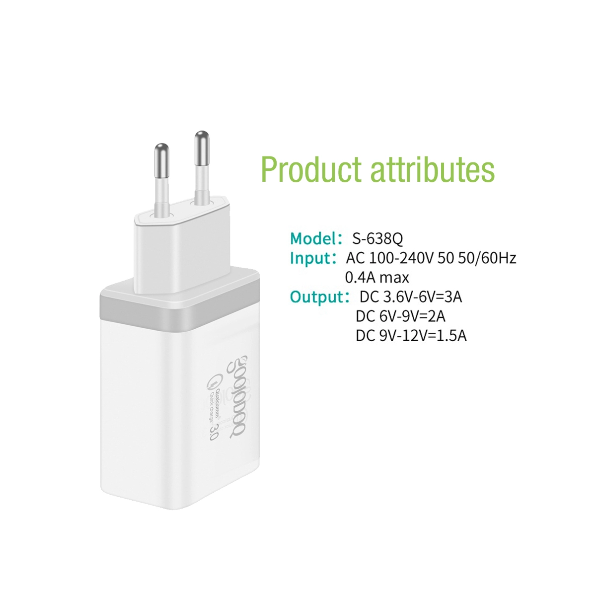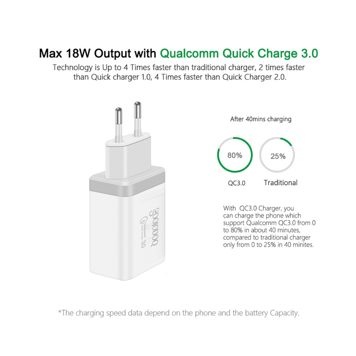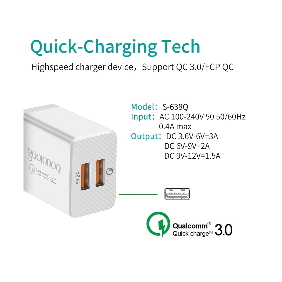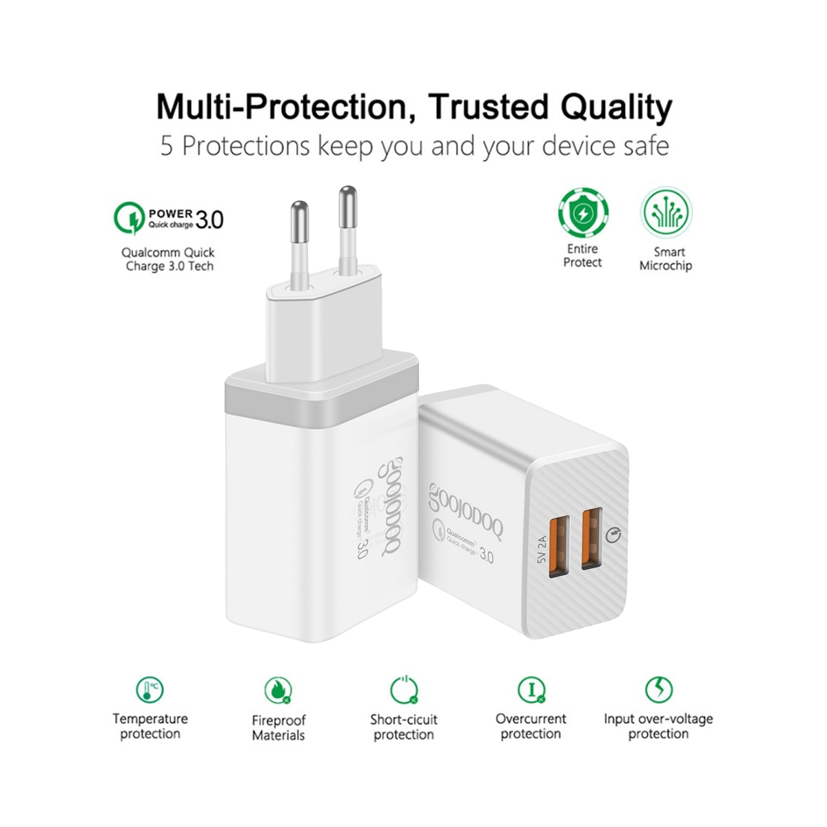 Incarcator retea, Goojodoq, pentru Telefon, Tableta, Gopro, Baterie externa, 2 porturi USB 3A, Qualcomm Quick Charge 3.0, alb